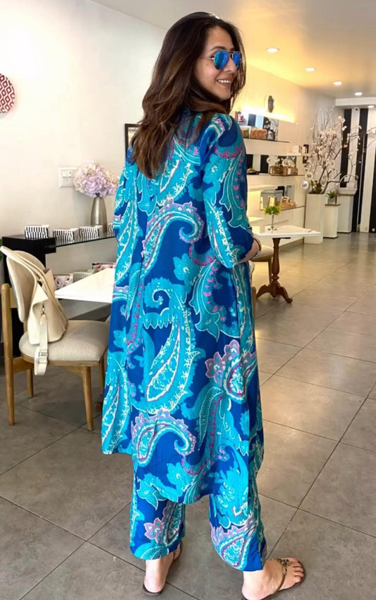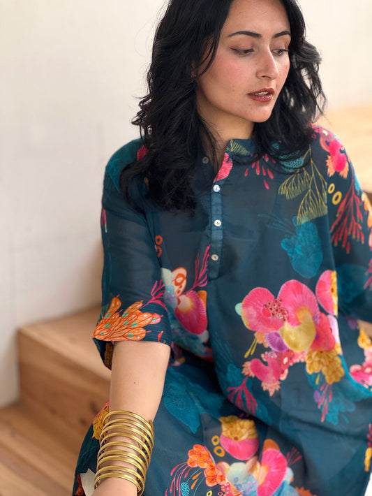 Green and Blue Hand Block Tiger Print Cotton Kurta Set