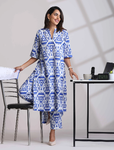 Blue Cotton Ikat High-Low Kurta Pant Set